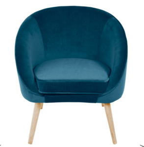 FAUTEUIL SAFIR Fauteuil en velours 100% polyester, contreplaqué et pin, mousse polyuréthane, pieds hévéa naturel ou hévéa teinté selon les couleurs du fauteuil L 75 x P 66 x H 76 cm, hauteur d’assise 45 cm Existe en bleu foncé, bleu clair, kaki, rose, gris foncé